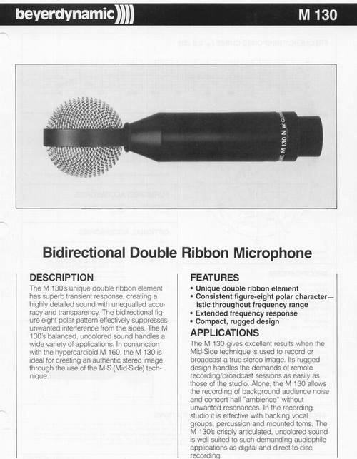 Elektrodynamický páskový mikrofon BEYERDYNAMIC M 130 N výrobce EUGEN BEYER ELEKTROTECHNISCHE FABRIK GMBH & CO. . D-7100 HEILBRONN se začal vyrábět v roce 1962 a vyrábí se dodnes. Je to první "novodobý" páskový mikrofon. Předtím byly vyráběny velké klasické typy M30 a M31.