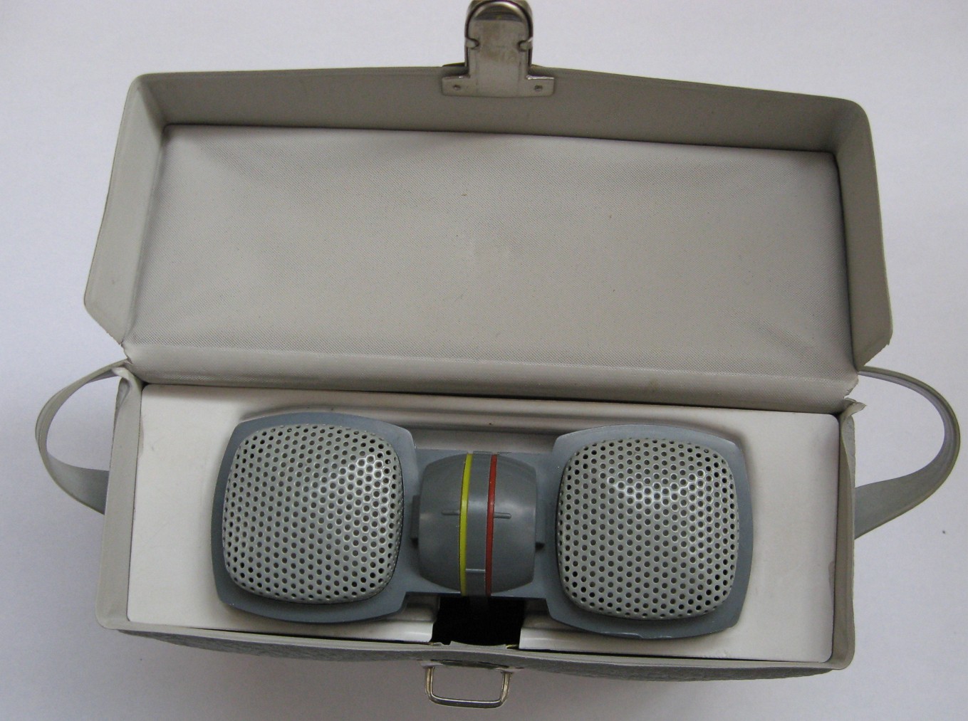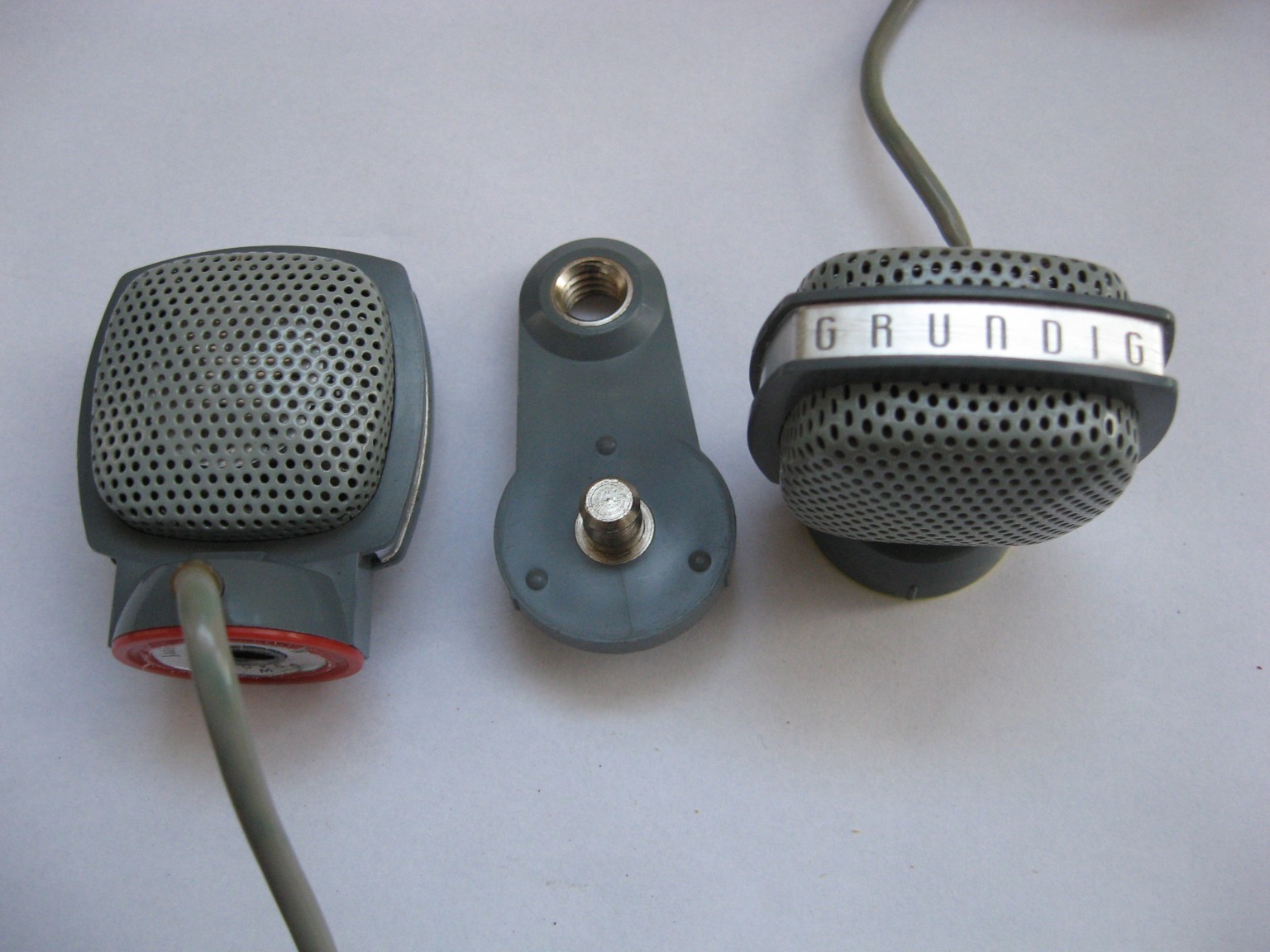 Dvojitý (stereo) dynamický mikrofon známého německého výrobce GRUNDIG byl vyroben v šedesátých letech minulého století. Dva zcela nezávislé mikrofonní systémy jsou spojeny s integrovaným držákem. Mikrofony lze natočit ve svilé ose v libovolném úhlu. Korpus a držák jsou plastové, krycí ochranná mřížka je z perforobaného plechu. Každý z dvojice mikrofonů má vlastní pevně připojený kabel. Třípinový konektor typu DIN se zabudovaným miniaturním transformátorem. Mikrofony lze od držáku zcela oddělit a použít každý samostatně