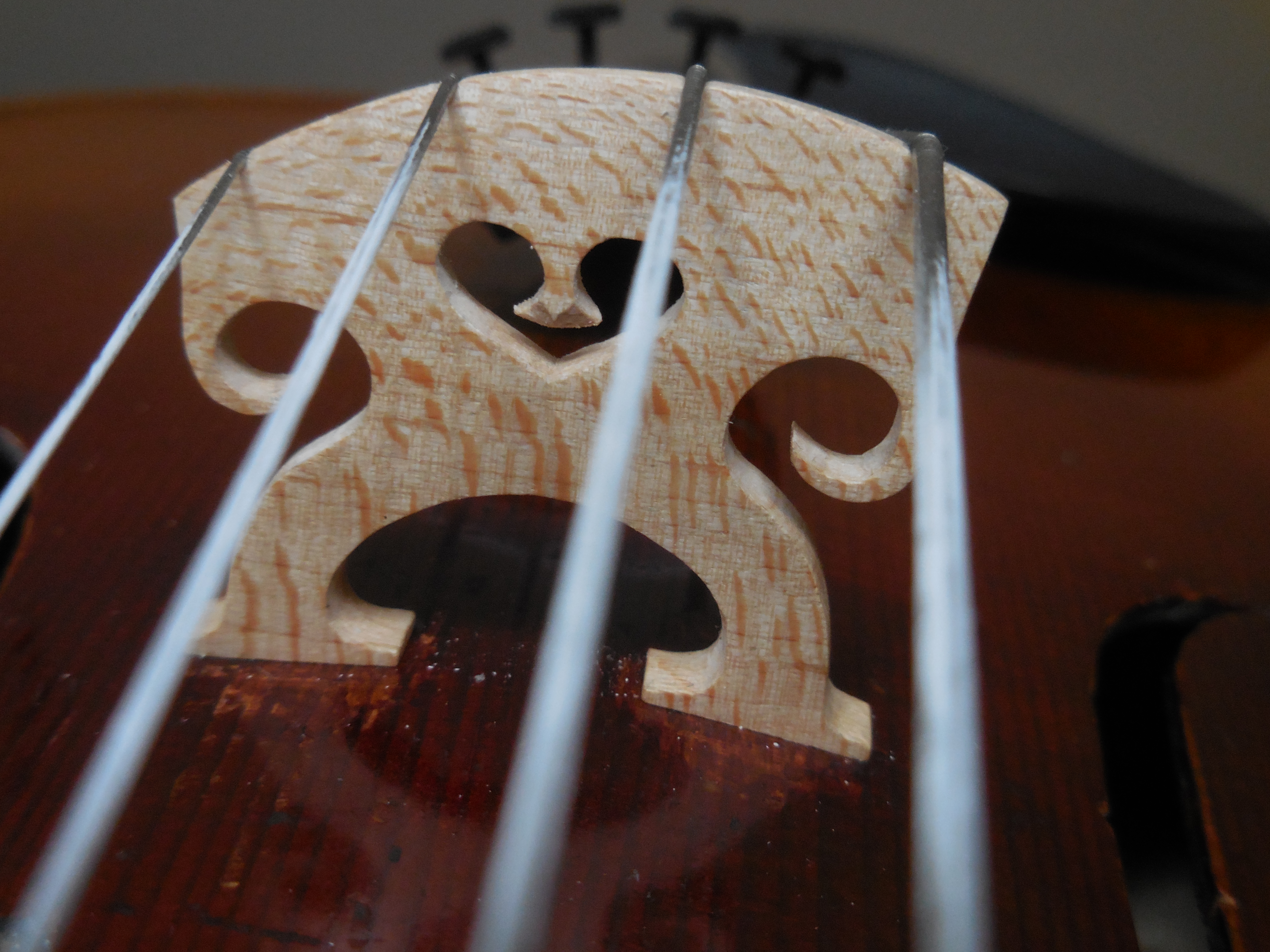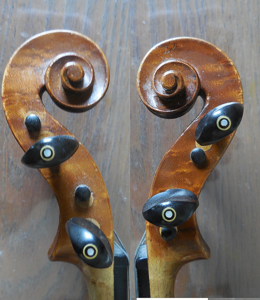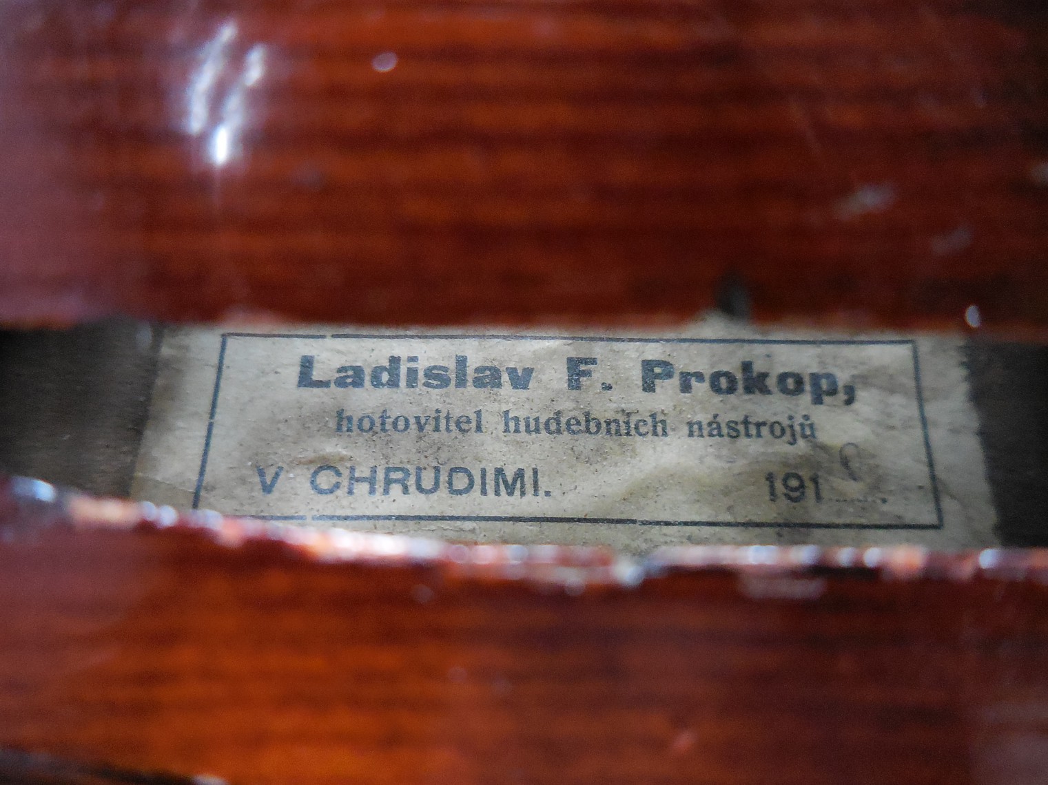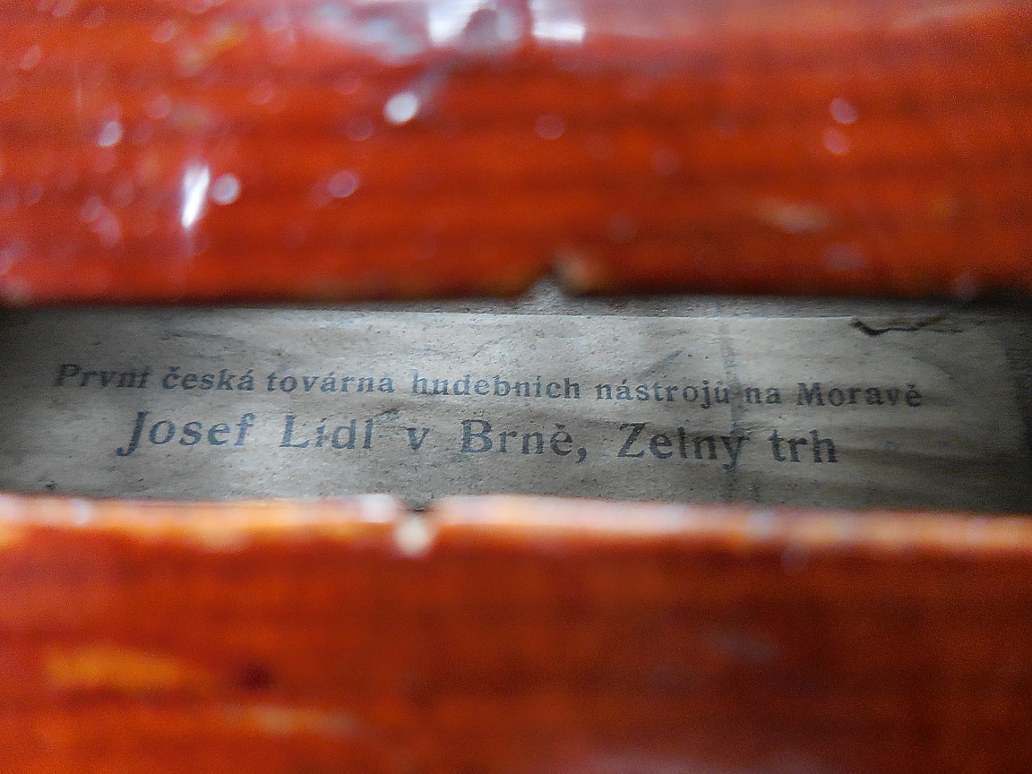 Nepamatuji se již, kdo mi tyto housličky donesl. Byly naprosto v rozkladu, zřejmě působením vlhka. Naštěstí toho moc nechybělo. Dohromady mi je dal houslař pan Petlach ze Sivic. Je to tzv. školní nástroj s typickým prokopovským klenutím desek, manufakturně vyrobený opět v Lubech u Chebu (Schönbach). Zajímavý je javor na zadní desce s pěkným žíháním pod tmavým lakem.