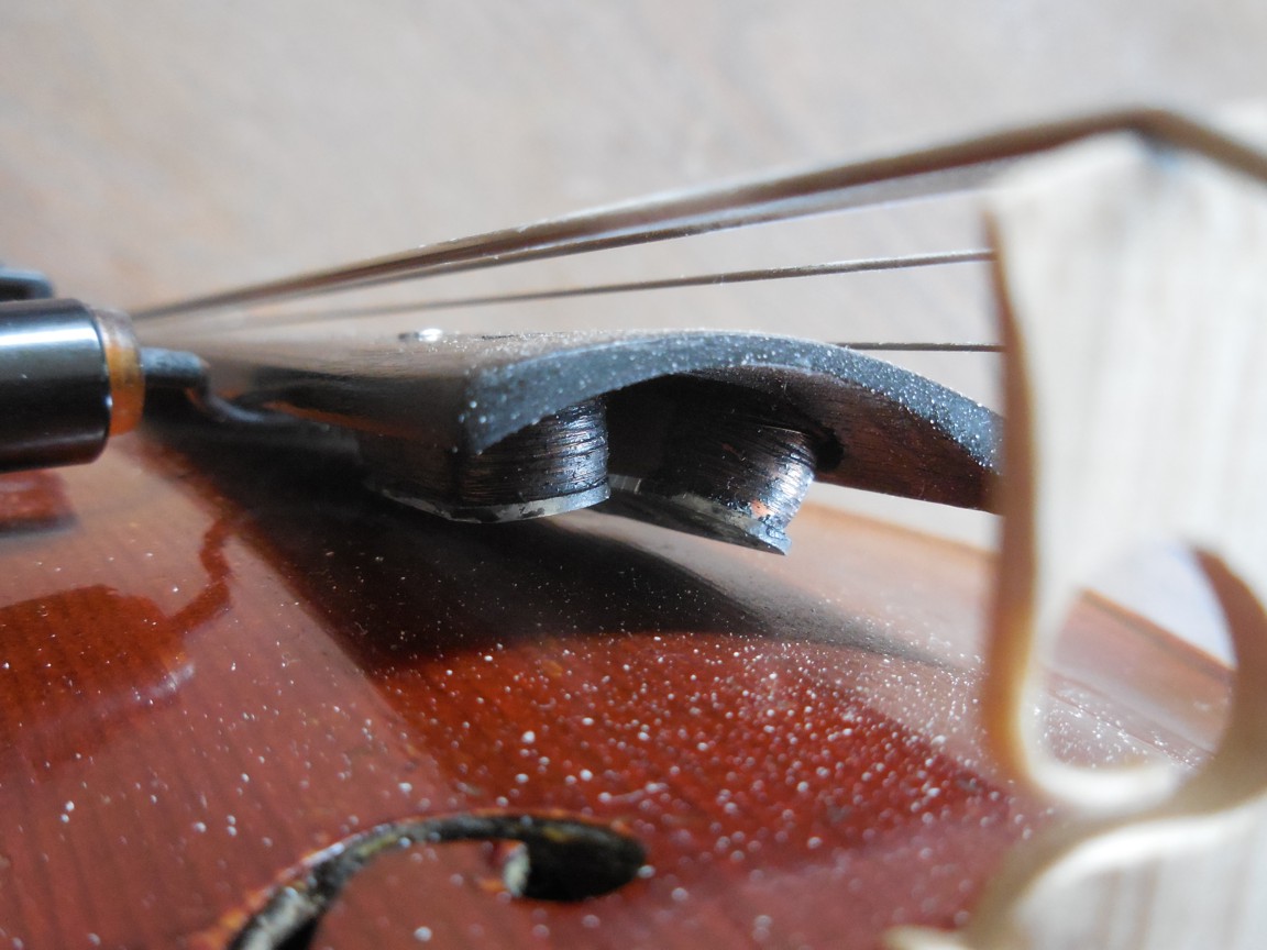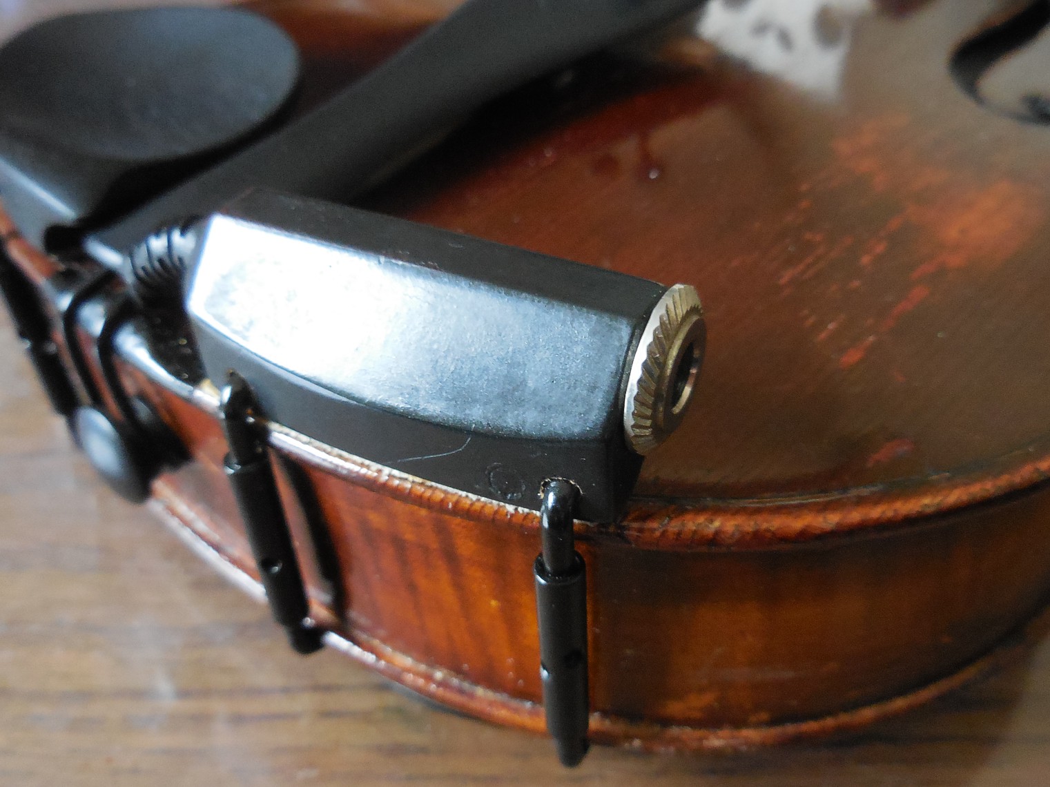Nástroj je vystrojen černou ebenovou garniturou. Ladící kolíčky jsou "Wittner FINETUNE PEGS" s vnitřním převodem 8,5:1, což mi umožňuje nepoužívat další dolaďovače. Tyto kolíčky mohu více než doporučit. Přeladění houslí do jiné tóniny stíhám během uvádění další písně. Struník mám ebenový ve starším vylehčeném provedení s kevlarovým poutkem "DICTUM Violin KEVLAR LOOP". Kobylku jsem si vyřezal sám, což mě baví, a housličky mi to zvukově odpustily (nebo jsem to trefil). Struny jsou kovové "THOMASTIK SUPER FLEXIBLE 15A". Mají ovinutou i E strunu, což docela účinně omezuje pískání. Ladička klipová "D'ADDARIO PW-CT-14". Mechanika ebenového podbradku je nerezová "DICTUM".